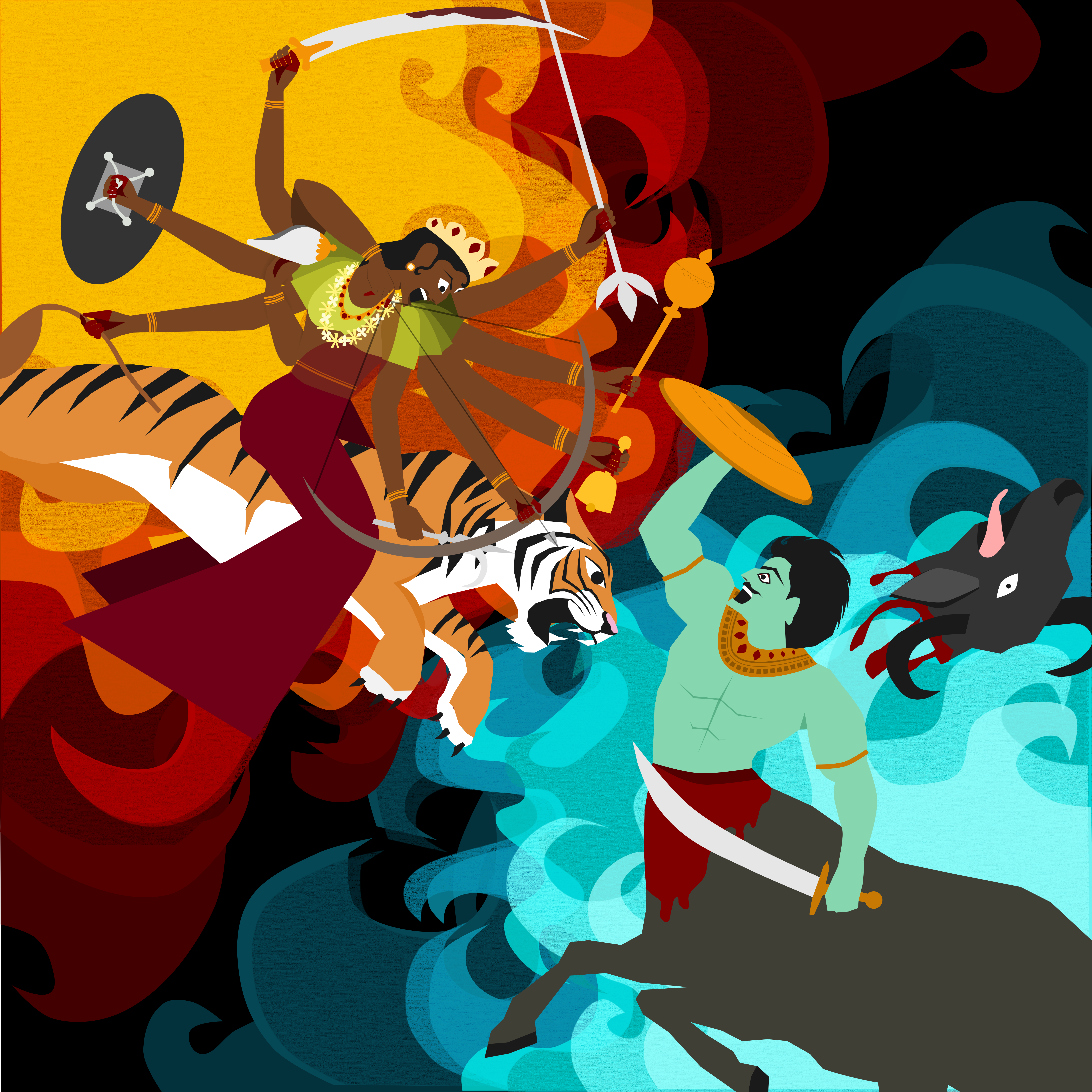 The battle between Mahishasura and Durga – ending in his ultimate defeat.