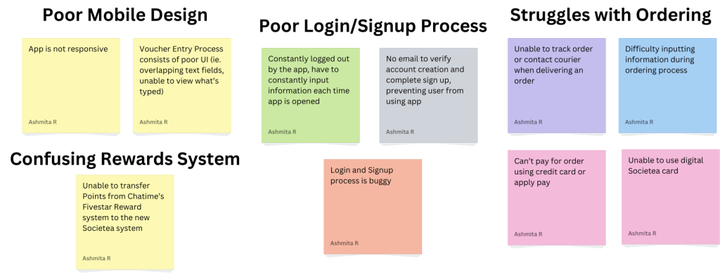 I started off by combing through all the current reviews on the app store and noted down the most insightful reviews about their struggles for each user on a set of sticky notes. To be frank, a lot of the criticism had to do with bugs within the app itself. However, there were a number of reviews that cited user pain points that can be handled through good UI/UX Design. By analyzing this feedback, I then sorted the sticky notes to identify four key paints that users were facing: